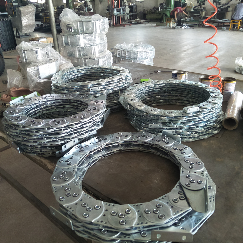 鋼制拖鏈的主體是由鏈扳(優質鋼板鍍鉻)、支撐扳(擠拉鋁合金)、軸銷(合金鋼)等部件組成,能使電纜或橡膠管與拖鏈之間不產生相對運動,不產生扭曲變形。鏈扳經鍍鉻處理,外形效果新穎結構合理,靈巧度高,鋼性好而不變形,安裝方便,使用可靠,易于拆裝,尤其是采用高強度耐磨材料合金銅為軸銷,提高了產品的耐磨強度,彎曲更靈活,阻力更小,降低了噪音,從而可保證長時間使用不變形,不下垂。